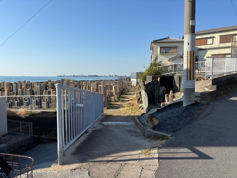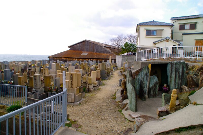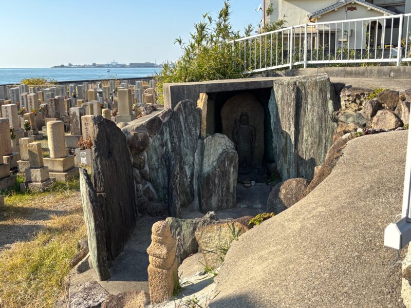 海岸沿いにある極楽寺の墓地の脇には、巨大な緑泥片岩りょくでいへんがんで造られたお不動さんの祠があります。大正6年5月、西島に住む卜部うらべ家(16参照)の卜部黄門うらべこうもんが個人で建立したものです。