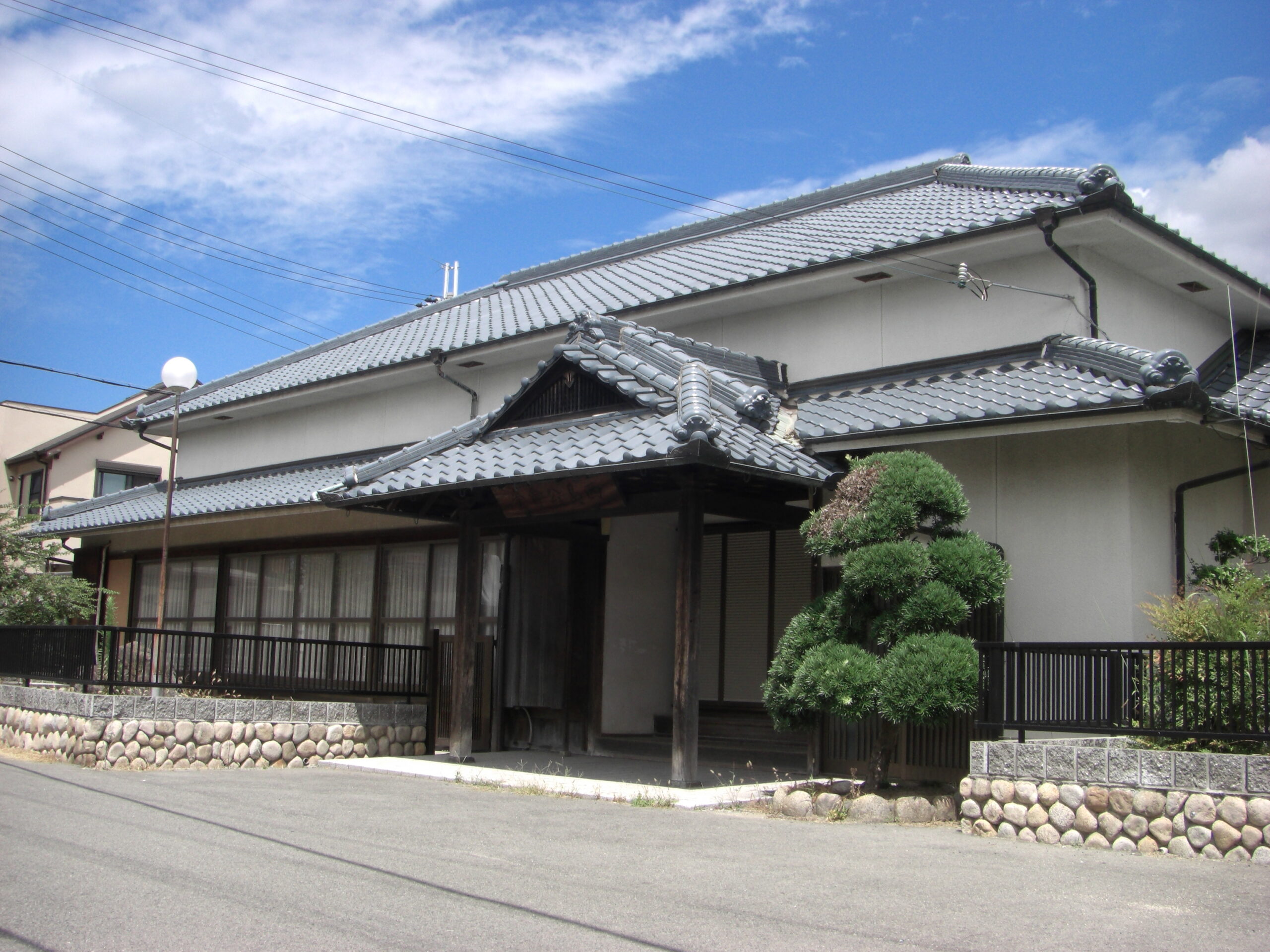 木造の古民家が改修された建物で、入母屋の玄関は格式があり、基礎には竜山石が使用されています。改修された低い柵の基礎には、丸石が積まれています。秋祭りの前には、ここで布団太鼓の組み立てが行われます。