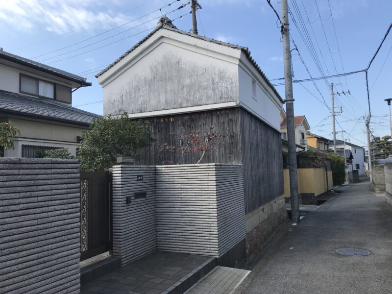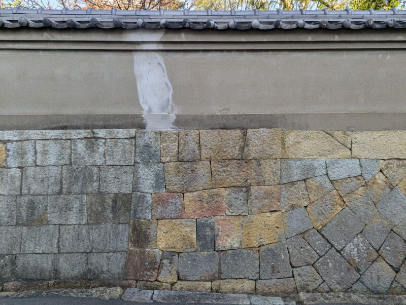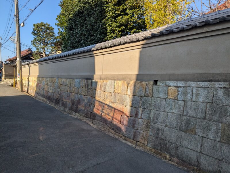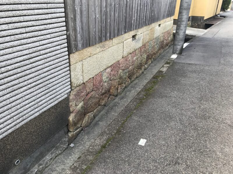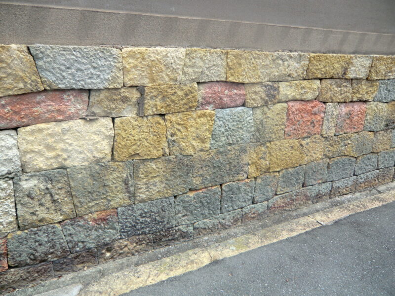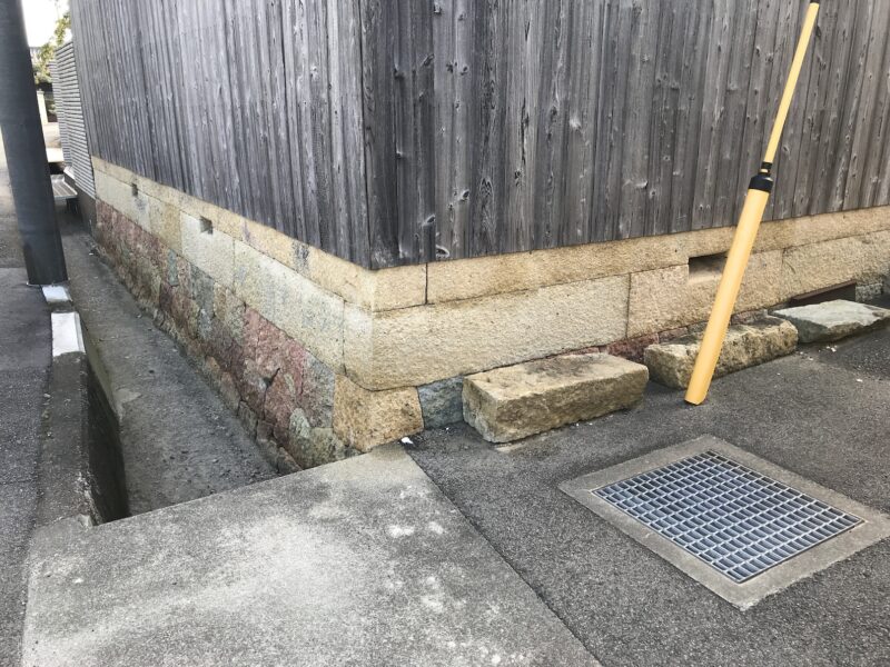 建物の基礎に、赤・黄・青の三色の竜山石がランダムに配置されています。赤い竜山石は、岩山の表層部で形成されるものであるため、古い時代に採掘されて、現在はあまり採掘されません。古い建物では基礎に石が使われていますが、赤い竜山石を使っている建物は、特に古くに建てられたことが推測されます。竜山石は、建築や造園用に多く使われる石で、この辺りでは高砂市の竜山・伊保山に大きな石切り場があり、明石でも多く使われています。