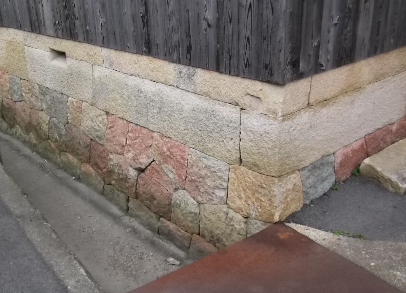 建物の基礎に、赤・黄・青の三色の竜山石がランダムに配置されています。赤い竜山石は、岩山の表層部で形成されるものであるため、古い時代に採掘されて、現在はあまり採掘されません。古い建物では基礎に石が使われていますが、赤い竜山石を使っている建物は、特に古くに建てられたことが推測されます。竜山石は、建築や造園用に多く使われる石で、この辺りでは高砂市の竜山・伊保山に大きな石切り場があり、明石でも多く使われています。