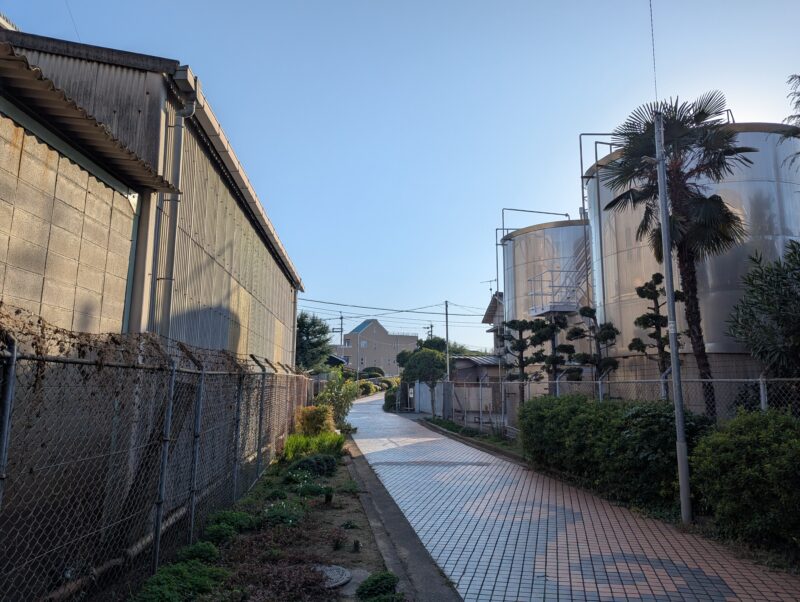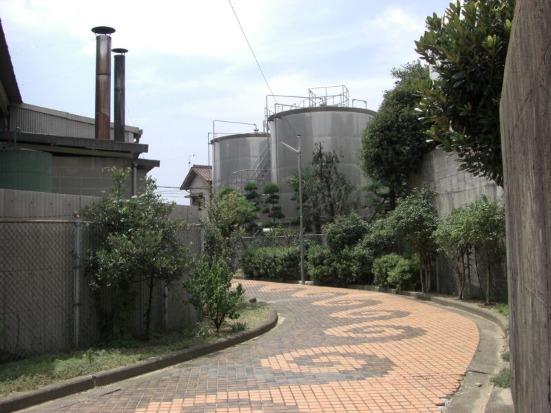 22.大和酒造 江井島 2026.03.052026.03.21 江井島 撮影年:2013年 大和鶴やまとづるの蔵元くらもとである大和酒造だいわしゅぞう付近で、赤根川緑地あかねがわりょくちから北東へ向かう遊歩道の両脇には、大型のタンクや酒造のための施設が建ち並び、歩くとお酒の町らしい趣おもむきを感じることができます。 明石ヘリテージマップ『江井島』2013 トイレなし駐車場なし 変化なく存在する。 撮影日:2025.12.07